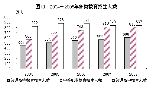 全年研究生教育招生44.6萬人,在學研究生128.3萬人,畢業生34.5萬人。普通高等教育招生607.7萬人,在校生2021.0萬人,畢業生512.0萬人。各類中等職業教育招生810.0萬人,在校生2056.3萬人,畢業生570.6萬人。全國普通高中招生837.0萬人,在校生2476.3萬人,畢業生836.1萬人。全國初中招生1856.2萬人,在校生5574.2萬人,畢業生1862.9萬人。普通小學招生1695.7萬人,在校生10331.5萬人,畢業生1865.0萬人。特殊教育招生6.2萬人,在校生41.7萬人。幼兒園在園幼兒2475.0萬人。