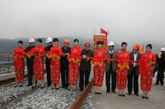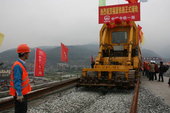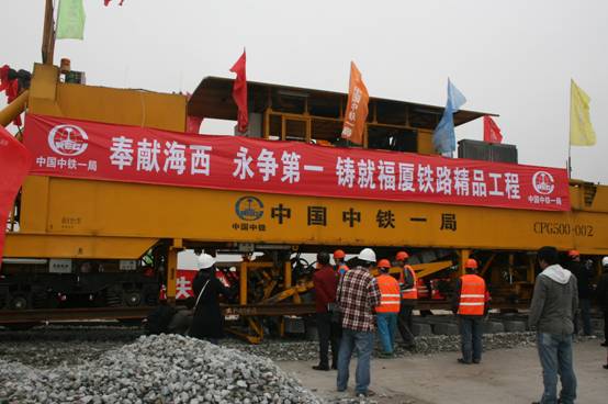 2009年3月8日,福州市鼓山腳下福廈鐵路樞紐閩江特大橋上,舉行福廈鐵路簡單的鋪軌儀式。上午 9 :08時,隨著東南沿海鐵路福建公司總經(jīng)理陳乃武“鋪軌開始!”的一聲令下,在一陣陣鞭炮和汽笛聲中,一臺標(biāo)有“中國中鐵一局”字樣的CPG500型長軌條鋪軌機(jī)組開始緩緩向前行進(jìn),并沿著兩根500米長軌條均勻地將一根根混凝土軌枕布設(shè)在路基上,這標(biāo)志著我公司承擔(dān)的福廈鐵路正式開始鋪軌。福建省、福州市重點(diǎn)辦、鐵辦以及東南沿海鐵路福建公司和中鐵一局領(lǐng)導(dǎo)參加了開鋪儀式。集團(tuán)公司副總經(jīng)理郭秀春、新運(yùn)公司黨委副書記、紀(jì)委書記鄭樹祥被邀請出席慶典。