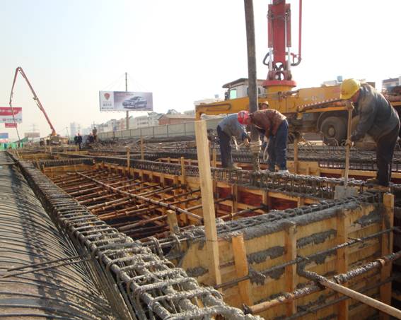 昆明東二環小莊改擴建工程一座拆舊換新的三層立交橋,該工程量大、期緊、技術要求高,施工干擾大,對安全防護、環保、文明施工要求高,是昆明市委、市政府的重點工程。針對該橋的特點,五公司項目部以集團公司及公司“三會”精神為動力,克服重重困難,積極組織開展 “大干180天”活動,全力抓施工進度。目前累計完成樁基293根,承臺49個,墩柱21根,并于3月4日對位于7號匝道的箱梁進行了澆注,這是昆明東二環五個標段中率先澆注的第一跨箱梁。為確保首跨箱梁澆注成功,項目部超前計劃,精心組織,并制訂了保證措施:一是實行項目領導、技術人員輪流值班,加強現場監控;二是提前對模板、支架進行逐一檢查,杜絕質量問題發生;三是組織包括外協隊伍在內的技術交底和動員會,做到人人心中有數;四是加強安全防護工作,派專人工在地出入口進行安全站崗、巡視;五是加強夜間施工照明,確保安全工作萬無一失。