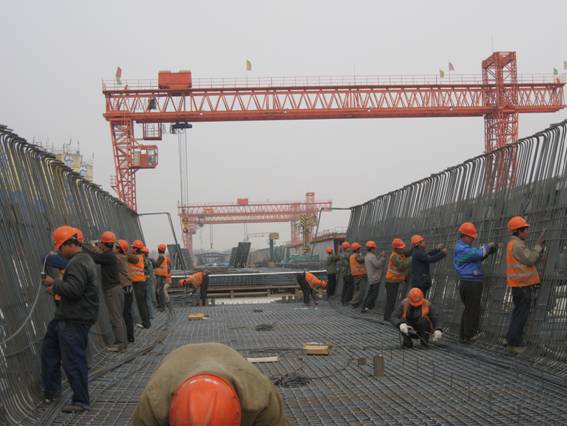 齊河制梁場為了使各工序銜接通暢,每次召開施工生產會議都要求勞務公司經理和帶班人員參加會議,明確形勢和任務,鼓勵他們就施工生產遇到的問題多對項目部提出意見和建議,大家共同獻計獻策,予以協調和解決。在生產箱梁的各工序的勞務公司配備上,除去鋼筋工段采用兩個勞務公司之外,均采用一個工序配備一個勞務公司,這樣做既有效的提高了施工生產效率,杜絕了各工序互相扯皮的現象,又確保指令可以及時準確的落實到位,在鋼筋下料和綁扎上采用的兩個班組,他們互相比、幫、趕,梁場鋼筋綁扎速度較原來大大提高,兩個鋼筋加工工段展開對手賽,鋼筋加工件滿足了需求,橋面、橋身鋼筋綁扎原來兩天半完成一跨,現在一天就可以完成一跨,使立模、吊裝、灌注各個工序銜接時間大大縮短,制梁周期由以往二天三跨,基本達到了一天兩跨的速度。