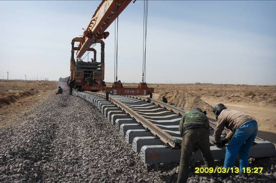 新建鐵路太中銀站前Ⅴ標(biāo)(靖邊~中寧東)線路全長287.921 km,架梁763孔,新鋪正線392.275km,站線鋪軌35.624km,鋪設(shè)道岔130組,其中正線鋪岔80組,上碴121萬m3,鋪碴整道392.275km,并一次性鋪設(shè)60kg/m無縫線路。
