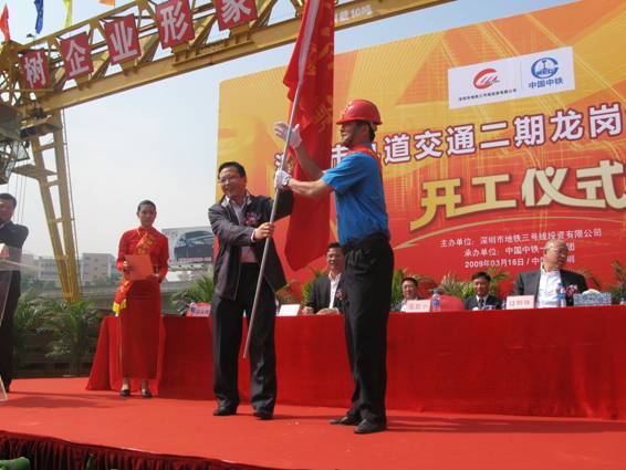 張思平副市長在典禮上向項目部青年突擊隊授旗。深圳市政府副秘書長、市軌道交通建設指揮部副總指揮趙鵬林、龍崗區區長張備分別講話致辭。