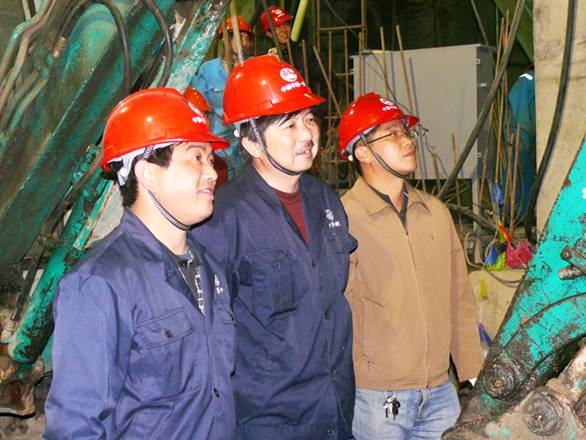 項目經理曾益平、盾構隊長馬新生及項目副經理李新紅看著盾構刀盤露出后展現出喜悅的笑容