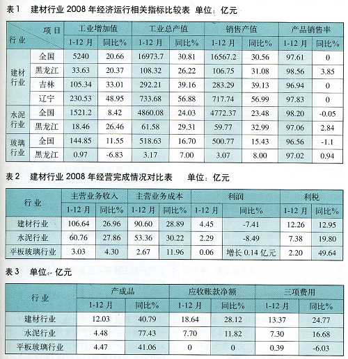 2008年黑龍江省建材工業經濟運行繼續保持良好發展態勢,與去年同期相比,生產和銷售增速較快,行業整體經濟效益較好,雖然經濟運行質量仍與全國平均水平小有差距,但工業增加值、工業總產值、銷售收入和利稅同比都呈兩位數增長,實現歷史最好水平。