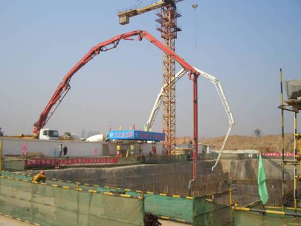 4月8日,中鐵一局建安公司西安分公司承建的西安曲江南窯村安置小區(qū)6號樓工地,艷陽高照,彩旗飄飄,機聲隆隆,人聲喧鬧,處處呈現(xiàn)著一派大干的景象。兩臺48m混凝土輸送泵車的長臂,凌空伸向6號樓的基坑,猶如兩條彩練當空飛舞,把一方方砼送入基礎筏板的鋼筋網(wǎng)片之中,總計1300m3的基礎筏板的澆注任務,從凌晨5點開始到夜間第二天凌晨6點止,一次澆注成功。