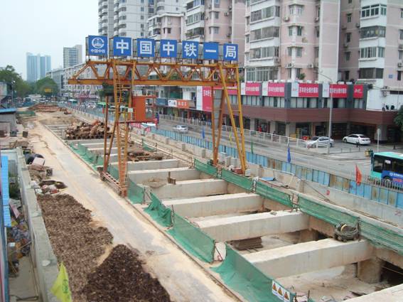深圳地鐵三號(hào)線紅嶺車站全長(zhǎng)461.37m,標(biāo)準(zhǔn)段寬20.7m、深17.3m,設(shè)7個(gè)地面出入口和3組地面風(fēng)亭。該站是深圳市目前所有在建地鐵項(xiàng)目中,唯一采用半蓋挖法施工的車站,交通影響嚴(yán)重、干擾大,安全防護(hù)責(zé)任重、工序復(fù)雜、施工難度大。