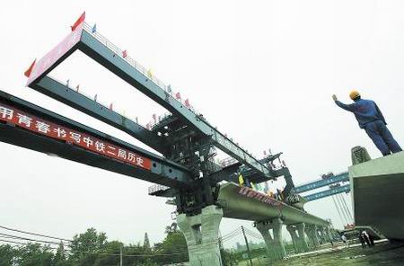 “首架成功!”昨日(22日)下午4時(shí)16分,在一陣熱烈的鞭炮聲中,一塊重達(dá)680余噸的箱梁被架上10米多高的橋墩,宣告我市災(zāi)后恢復(fù)重建的重大基礎(chǔ)設(shè)施項(xiàng)目——成都至都江堰鐵路成功實(shí)現(xiàn)首孔32米箱梁的架設(shè),標(biāo)志著成灌鐵路建設(shè)由地面基礎(chǔ)工程正式轉(zhuǎn)入“空中”建設(shè)階段。根據(jù)施工進(jìn)度,成灌鐵路的所有箱梁將在9月30日之前架設(shè)完成并開(kāi)始鋪軌,整個(gè)軌道鋪設(shè)工作將在明年1月10日之前完成,實(shí)現(xiàn)主體工程完工,明年5月建成通車。