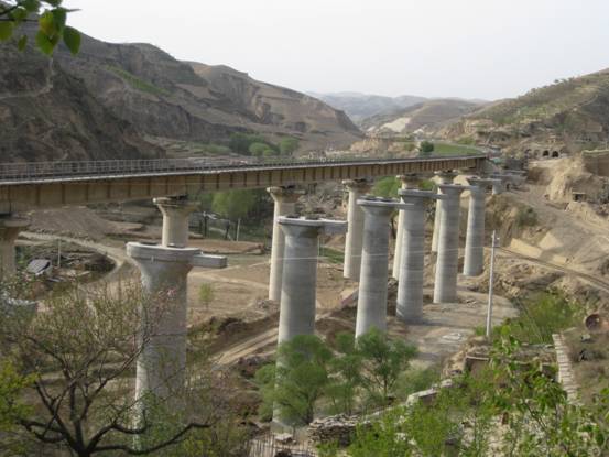 王家砭溝大橋全長276.06米,全橋共9孔,其中4孔24米,5孔32米,共有樁基礎(chǔ)18根,316米;明挖基礎(chǔ)5個,混凝土877立方米;挖井基礎(chǔ)1個,混凝土199立方米。該橋有8墩、2臺,墩臺混凝土總方量2166立方米,其中最高墩為22米。它的建成為包西鐵路增添了一道靚麗的風景。