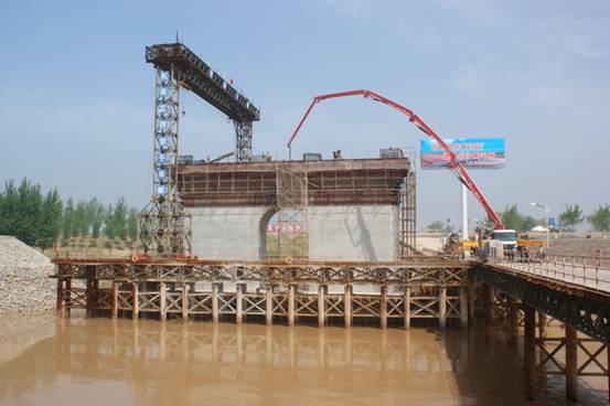 由于外形酷似凱旋門,所以現場的工人們都稱1號墩身為1號“凱旋門”。伴隨著1號墩澆注的完成,黃河大橋又展開了新一輪的百日大干,趕工期、搶進度,確保京滬高鐵按時通車。