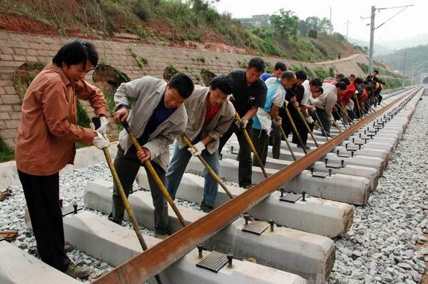 面對達(dá)成線后期施工工藝多且復(fù)雜,工期緊、任務(wù)重的情況,項目部分工明確,采用一個負(fù)責(zé)人管理一個工點的專管方式解決達(dá)成線點多線長的問題,并設(shè)立綜合調(diào)度室對各作業(yè)隊所有機械設(shè)備、材料實施資源共享,統(tǒng)一調(diào)配,加大現(xiàn)場組織協(xié)調(diào)。與此同時,項目部也創(chuàng)下了達(dá)成線施工以來的一些新紀(jì)錄:熊國敏所帶的人工鋪軌隊在創(chuàng)12小時內(nèi)卸50根500M長軌的好成績后,在5月1日又創(chuàng)下日鋪軌2.5KM的好成績。