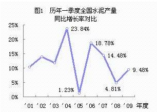今年一季度全國水泥產量2. 8億噸,比去年同期增長9.5%。去年年初南方冰凍雨雪災害損失水泥產量1100多萬噸,今年在此基礎上的水泥產量增長率,在2000年以后仍屬較低水平(見圖1)。預計今年上半年全國水泥產量6.8億噸,比去年上半年增長4.6%。