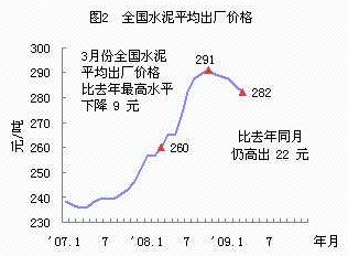 水泥價格連續四個月下降,但全國水泥價格總水平仍比去年同期高。三月份全國水泥平均出廠價格每噸282元,比去年10月份下降9元,比去年同月高22元(見圖2)。