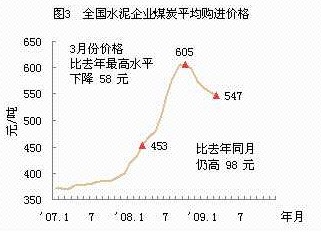 煤炭價格下降,但仍處于較高價位。三月份水泥企業煤炭購進價格平均每噸547元,比去年10月份下降58元,比去年同月高98元(見圖3)。