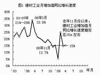 1-4月份規模以上建材工業完成工業增加值1633億元,按可比價格計算比去年同期增長14.4%(工業增加值均按可比價格計算,下同);4月份當月建材工業完成工業增加值503億元,比去年同月增長15.4%。去年3~11月建材工業增加值月同比增長速度逐月快速下滑,11月至今年4月份,建材工業增加值月同比增長率已穩定在15%左右。2003~2008年,建材工業增加值增長速度都保持在20%~29%之間,今年建材工業增長速度是2003年以來最低水平(見圖1)。