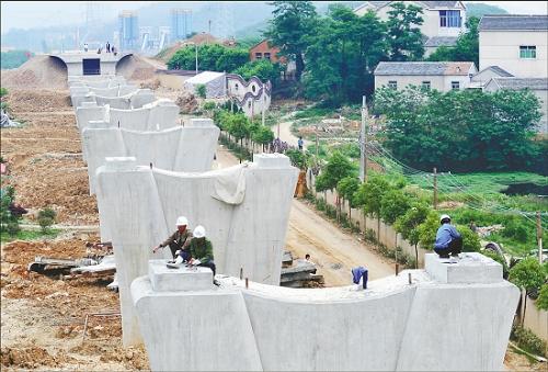 滬寧城際鐵路南京段的建設近期持續保持“高速度”,目前軌線巳向上海方向逐日延伸。由于工程采用了當今世界上先進的無砟軌道技術,鐵路沿線均可以減少維護、降低粉塵、美化環境。圖為南京段的鐵路高架線正穿村而過,與周邊環境相融形成新景觀。