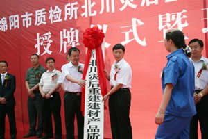 近日,綿陽市質(zhì)檢所北川災(zāi)后重建建材產(chǎn)品質(zhì)檢站授牌儀式在北川隆重舉行。四川省人民政府副秘書長李家國、四川省質(zhì)量技術(shù)監(jiān)督局局長劉云夏將“綿陽市質(zhì)檢所北川災(zāi)后重建建材產(chǎn)品質(zhì)檢站”的吊牌授予綿陽市質(zhì)檢所所長笪海玲、北川災(zāi)后重建建材產(chǎn)品質(zhì)檢站站長岳寶。