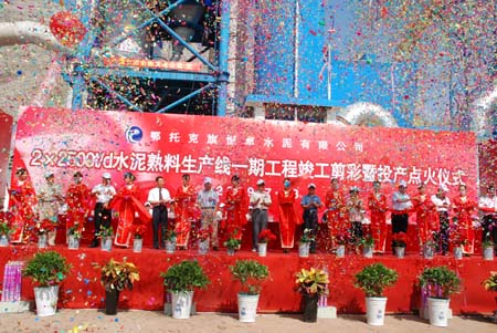 7月18日,內蒙古鄂爾多斯市棋盤井鎮鑫宇集團恒卓水泥公司內鑼鼓喧天、彩旗飄揚。該公司建設工期近一年的兩條日產2500噸新型干法熟料水泥生產線一期工程在此成功進行點火投產儀式。