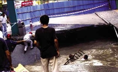 下午記者在現場看到,海印電器總匯二場外墻的廣告牌凸出,數名地鐵施工人員正用鐵板圍住下沉的路面,多名人員進入下沉路面勘探。到下午3時17分,記者突然聽到“轟”的一聲巨響和“啊”的一聲尖叫,抬頭望去,只見路面升起一股煙霧并濺起3米高的水花,隨后聞到一股濃烈的煤氣味。地鐵施工人員、自來水公司員工和市場保安全都跑向下沉路段,并疏散附近市民。記者看到,下沉路面裂開一個大洞,面積約30平方米、深約2米。塌方處積滿污水,一名施工人員連同路面一起掉了進去,數分鐘后,該人員被拉上路面,并無大礙。“幸虧他綁著安全帶,不然必死無疑。”一名施工工人說。