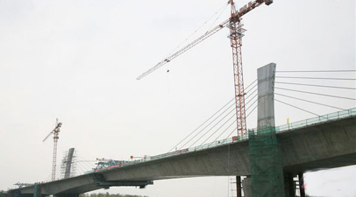 上海A15公路是長三角高速公路網中的重要組成部分,也是2010年上海世博會重要配套工程。南與浙江申嘉湖高速公路相接,東至上海浦東國際機場,設計為雙向六車道。大蒸港矮塔斜拉橋是A15公路中的一個關鍵性控制工程,位于上海松江區石湖塘鎮,大橋跨徑345米,其中主跨165米,在上海目前同類橋梁中跨度最大。該橋處在緩和曲線和圓曲線上,是上海市第一座三向曲線矮塔斜拉橋,具有曲線、斜(鋼)塔、超寬幅面、大型掛籃、超大張拉力(索)和巨型支座等多項施工技術融合于一身的特點,科技含量高,橋型新穎獨特。2008年初開工以來,二十四局集團A15工程項目部克服工期緊、技術難度高、安全風險大等困難,根據該橋采用懸臂掛籃法施工的特點,自行研制了自重150噸,頂面寬度34米,最大施工節段4.5米,最大施工節段混凝土430噸的特大懸臂施工掛籃,為目前國內最大的橋梁施工掛籃之一。合龍施工精心選擇在最合適的時間段、最佳的氣溫下進行,確保了大橋的順利合龍。該橋的勝利合龍,表明了二十四局集團的造橋工藝及技術水平又有了新的提高,也為上海A15公路按時建成,服務上海世博會奠定了基礎。