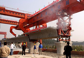 由中鐵電化局西鐵工程公司承建的京石鐵路客運專線控制性重點工程——永定河特大橋日前開始架梁。桔紅色的巨型架橋機將一片近900噸的客運專線箱梁平穩安放在橋墩上,標志著京石客運專線最長的橋梁施工進入新的階段。至此,京石鐵路客運專線橋梁架設全面展開,掀起新一輪鐵路建設高潮。