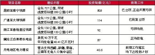 18項新開工重點工程分別是:(1)成都至蘭州鐵路;(2)重慶至貴陽鐵路;(3)昆明至南寧鐵路;(4)廣通至大理鐵路;(5)麗江至香格里拉鐵路;(6)西安至寶雞客運專線;(7)蘭州至烏魯木齊鐵路增建第二線;(8)西安至安康鐵路增建第二線;(9)廣元至南充高速公路;(10)廈門至成都高速公路石壩至納溪段;(11)陜西安康至漢中高速公路;(12)四川大渡河瀘定、云南瀾滄江功果橋水電站;(13)廣西魚梁、老口航運樞紐;(14)四川嘉陵江亭子口水利樞紐;(15)成都雙流機場改擴建;(16)西安咸陽機場改擴建;(17)西部支線機場;(18)無電地區電力建設。