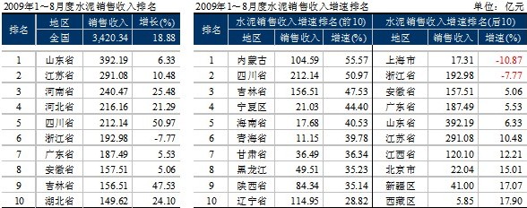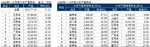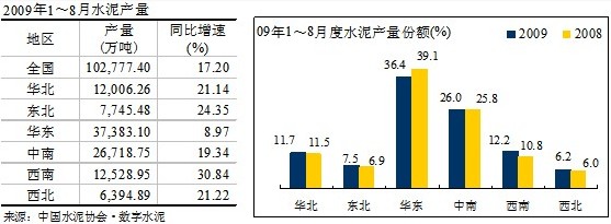 隨著一系列基礎建設投資計劃的實施,尤其是許多重點工程的開工建設,水泥產量增長較快。1~8月份全國水泥產量102,227萬噸,同比增長17.20%,較上年約提高了10個百分點。其中,西南地區的水泥產量同比增長在30%以上;西北、東北、華北、中南的產量增速在20%左右;而華東地區的水泥產量增速僅為8.97%。華東地區從08年占全國的39.1%降到了36.4%,下降約3個百分點,其他地區均有所增長。預計今年全國水泥產量將超過16億噸。