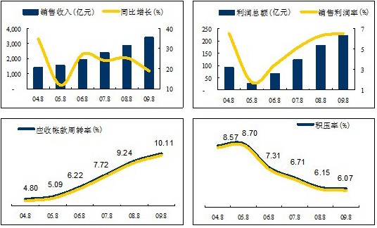 年初以來實施的一攬子刺激經濟計劃效果有所顯示,經濟從2季度起企穩回升,3季度的7、8兩個月加快復蘇,逐步走出低谷。4萬億投資拉動下,需求超預期,促使產量增長,銷售收入、利潤總額同步提升。但同時產能快速釋放所帶來的壓力,使行業的毛利率表現不佳。前期對水泥庫存的消化為傳統四季度旺季的到來奠定了基礎,但四季度經濟效益水平提升主要取決于水泥價格提升的后續動力。