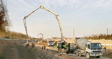 11月30日下午,工人們正在唐山市環城水系陡河建華橋段進行護坡混凝土澆筑。