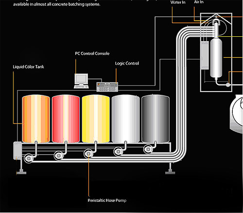 由混凝土配色軟件(Concrete Palette)選定顏色后對邏輯控制器發出指令,邏輯控制器指揮配電板啟動蠕動軟管泵進入混合器混合,可加水和加壓混合,均勻后由蠕動泵直接打倒混凝土攪拌車或混凝土攪拌機內。