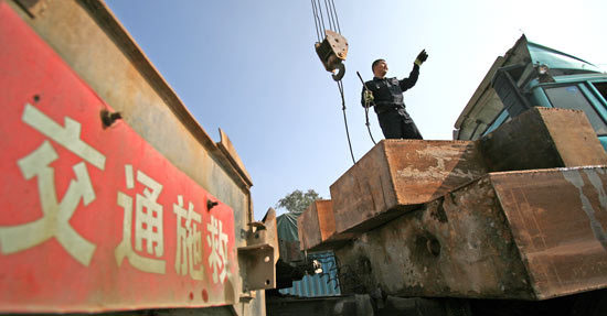大貨車上運載的6塊鋼筋混凝土塊全部移位,其中兩塊移到大貨車與掛車中間的連接橋上方,將大貨車的一個油箱壓破,柴油流得滿地都是。另外3塊壓在小車上的鋼筋混凝土塊已被吊回到平板掛車上。