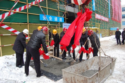 在蘇寧電器集團與中建五局的聯合推動下,伴隨著高質量與高品質的建設,威海蘇寧電器廣場于2010年1月8日提前完成了結構封頂,今日上午10:18,特別準備好的鞭炮、禮炮齊鳴,寫滿項目恭賀封頂和項目優勢的紅色橫幅掛滿項目正立面,恭賀項目提前封頂的拱門等也已布置到位。冒著幾十年不遇的暴雪嚴寒,項目提前完成結構封頂距離蘇寧電器廣場在威海的亮相已越來越近。