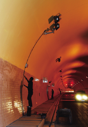 圖為工人在隧道里做最后的修補(bǔ)工作