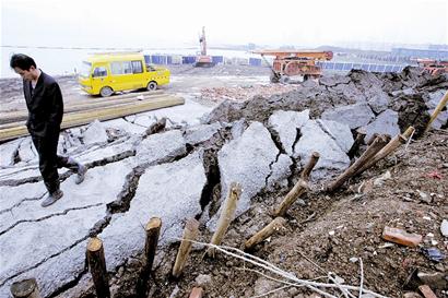 沙湖大橋的東引橋工地緊鄰垃圾山。據知情人士介紹,垃圾山原本不在引橋建筑紅線內,但由于塌方,垃圾山目前已侵入紅線約7米。紅線內施工方剛剛用混凝土澆筑的、面積達360平方米的場地,因受垃圾山的擠壓全部拱起報廢,直接經濟損失達10多萬元。施工方拉起來的電線桿也被折斷,差點砸中一名在工地值班的保安。