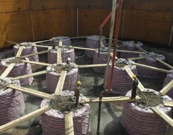 重慶兩江橋——長江東水門大橋和嘉陵江千廝門大橋,為塔式斜拉公軌兩用橋,共有3座主塔。此次嘉陵江千廝門大橋主塔基礎封底混凝土澆筑為3座主塔首次。由于基坑深12米,雙壁鋼護筒直徑35米,封底厚3.5米,所需封底混凝土2300立方,屬超大深基坑大方量混凝土灌注施工。首次主塔基礎封底混凝土澆筑的成敗,將對大橋基礎能否搶在汛期前完成和確保下一道施工工序的順利銜接起到至關重要的作用。對此,業主、監理、質監單位特別關注,擔負施工的中國鐵建中鐵十三局一公司橋隧公司領導高度重視,一公司副總經理兼橋隧公司經理王學哲強調指出,主塔基礎首次大方量混凝土施工關系重大,要嚴格按照技術規范科學組織施工,各個環節控制到位,確保一次成功,一次成優。為實現這一目標,兩江橋項目先后多次組織技術人員和施工負責人進行專題研究,反復優化比選混凝土灌注方案,并就人員分工、物資設備配置、電力保障、混凝土供應、技術交底、質量控制、安全措施等各個方面進行嚴密的部署安排。一切準備就緒,3月17日上午9時,主塔基礎封底混凝土施工按計劃如期開盤,管理人員、技術人員、物資、電力保障人員各司其職,歷時48小時,圓滿完成2300多方混凝土灌注任務,經過現場檢測,施工質量控制完全達到技術規范標準。