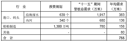 大直徑PHC 管樁產品主要用于大型水上建筑工程施工項目及沿水且承重要求較高的大型建筑的樁基礎建設。由于其產品的針對性,基礎設施建設領域的港口、碼頭以及船舶制造業等涉及水工建筑項目施工的行業為與其緊密相關的下游行業。而根據我國“十一五”總體發展規劃,上述行業均為“十一五”期間國家大力發展、重點投資對象。