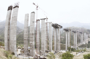 5月27日,在施工現(xiàn)場多座上百米高的橋墩上一派忙碌,建設(shè)單位晝夜施工以使這條交通干線早日通車。