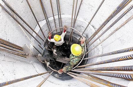 6月22日上午,宜昌市夷陵區(qū)霧渡河宜巴高速建設(shè)工地的工人們正在井下安裝高速公路橋墩鋼結(jié)構(gòu)。