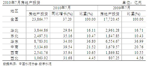 2010年1~7月份,房地產(chǎn)投資較去年同期增長37.2%,基本保持穩(wěn)定,中南地區(qū)仍然保持最快增速,但速度小幅放緩,華北地區(qū)繼續(xù)維持自年初來的下滑趨勢。地區(qū)中,海南、福建、廣西增長超過60%;河北省也保持52%的同比增速,居全國第四位。