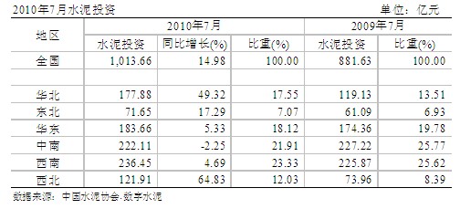基于已開工項目的延續(xù)性,2010年1~7月份,水泥投資額繼續(xù)增加,并突破千億元,但累計同比增速繼續(xù)保持放緩態(tài)勢,為14.98%,水泥投資額排名首位的西南地區(qū)同比增速繼續(xù)保持放緩態(tài)勢,但幅度較小,僅比1~6月份下降0.34個百分點。地區(qū)中,四川投資額繼續(xù)保持首位,但繼續(xù)保持負增長狀態(tài),投資額排名第二、第三位的河北、貴州兩地都保持較高的同比增速,分別為77.5%、117.3%。