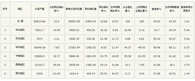 同期全國水泥生產量為84814.66萬噸,比上年同期73429.76萬噸增加了11384.9萬噸,增長15.5%,增幅高于去年同期2.19個百分點。散裝水泥增長幅度高于水泥增長幅度4.18個百分點。