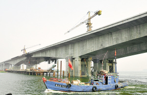 日前,天津?yàn)I海新區(qū)中央大道永定新河特大橋最后一段混凝土澆筑施工順利完成,大橋主體合龍。