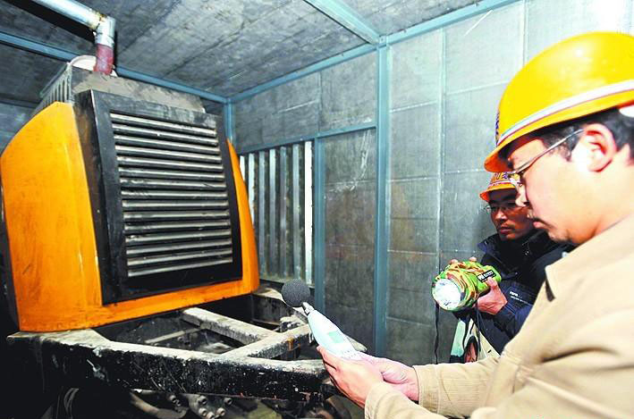 如今,這個難題已經(jīng)破解。在工地南側(cè) ,這里的一臺混凝土輸送泵車被罩在一個綠色的小房子里,站在房間外,盡管還能聽到泵車運(yùn)轉(zhuǎn)的聲音,可噪音已經(jīng)明顯降低。工作人員用隨身攜帶的噪聲測試儀一測,分貝數(shù)值為70.8。拉開小屋一側(cè)的一扇小門,記者剛進(jìn)入其中,就聽到“轟轟”的巨響,呆一會兒就感到頭疼。“我們剛才在里面測過了 ,里面的分貝數(shù)達(dá)到了113.9分貝。”出了小屋,工作人員告訴記者。