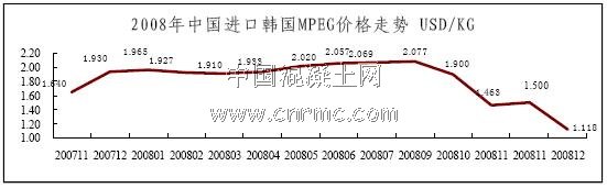 2008年8月也是我國進口韓國MPEG價格最高的月份,進口價格2007美元/噸,隨后,進口價格開始下滑,直到年末下滑趨勢仍在繼續。縱觀整個2008年(如圖二),我國進口韓國MPEG由1927美元/噸跌到1118美元/噸,跌幅達42%,較07年12月份同比下降37%。
