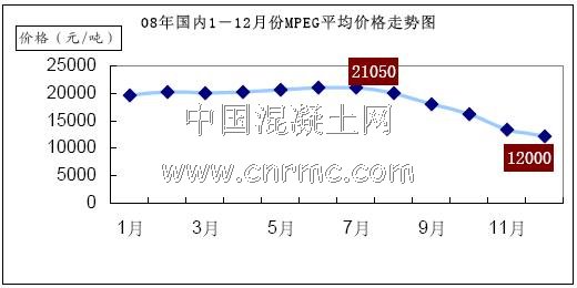 據不完全統計,2008年國內MPEG全年平均價格18000元/噸,受原材料價格的影響,不同月份價格差別較大,8月份 MPEG平均價格升至21050元/噸(如圖一),8月以后各月價格都低于平均價格,年末跌至12000元/噸,較最高月份,跌幅達40%。當時,國內外正處在金融危機爆發的關口,國際油價一路飆升,經濟動蕩不安。8月份成為08年MPEG價格的轉折點,8月過后,國際國內原材料價格開始直線下滑,世界經濟危機凸顯,MPEG價格隨之跌到現在。