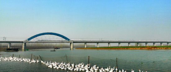 2、“和諧號”動車飛躍京滬高鐵澮河系桿拱橋