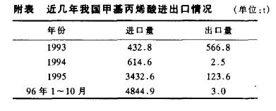 近年來,隨著我國化學工業及其相關工業的迅速發展,對甲基丙烯酸的需求增長也較為迅速,由于國內市場產不足需,進口量年年增長。我國近幾年甲基丙烯酸進出口情況見附表。