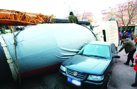 20日凌晨4時左右,建設集團一大型混凝土攪拌車在向渤海新世界工地運送混凝土途中發生側翻,所幸沒有造成人員傷亡。