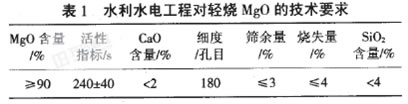 直接將粉狀MgO膨脹劑與混凝土的其它原材料(如水泥、碎石、砂子、粉煤灰等)一起攪拌而成的混凝土,可以根據(jù)混凝土結(jié)構(gòu)設(shè)計要求的補償收縮量,通過調(diào)整MgO膨脹劑的緞燒設(shè)備、燒成溫度、高溫下的保溫時間、摻量、外摻混合材的種類等手段來調(diào)節(jié)混凝土的膨脹速率和膨脹量。利用這種方法配制M沙微膨脹混凝土,相對使用內(nèi)含MgO量較高的水泥而言,方便靈活,實際工程應(yīng)用較多[9]。1994年,能源部、水利部水利水電規(guī)劃設(shè)計總院頒發(fā)了用于水利水電工程的輕燒M四膨脹劑的技術(shù)要求— 《水利水電工程輕燒MgO材料品質(zhì)技術(shù)要求以行),見表1。