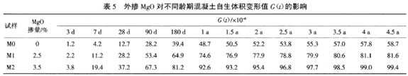 將編號為MO、M1、M2的混凝土力學(xué)性能實驗試件脫模后放置于恒溫(20士2)℃、相對濕度不低于95%的環(huán)境中養(yǎng)護,變形試件放置于恒溫(20士2)℃、絕濕環(huán)境中養(yǎng)護,測得混凝土試件的力學(xué)性能、體積變形值G(t)及它們隨MgO摻量變化的相對結(jié)果和隨時間t變化過程曲線分別見表4、表5,圖1。