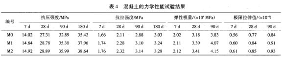 (l) 在相同條件下,外摻MgO膨脹劑的混凝土各個齡期的力學(xué)性能指標均比未摻的高,并隨著MgO摻量的增加而增大。以90d齡期為例,外摻MgO膨脹劑的混凝土的抗壓強度、抗拉強度、彈性模量和極限拉伸值均比未摻的提高6%-9%。
